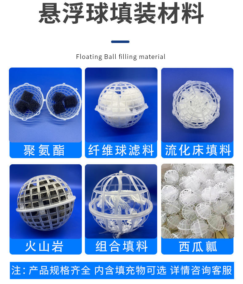 多孔球形生物懸浮球填料為什么也屬于一種組合填料,因為懸浮球填料具有全立體結構,里面可以填充聚氨酯海綿 火山巖 陶粒 沸石 脫氮填料 纖維濾料等生物水處理濾料【填料】。